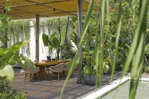The outdoor poolside dining and rooftop terrace are built from a 100-year-old pier from Borneo.