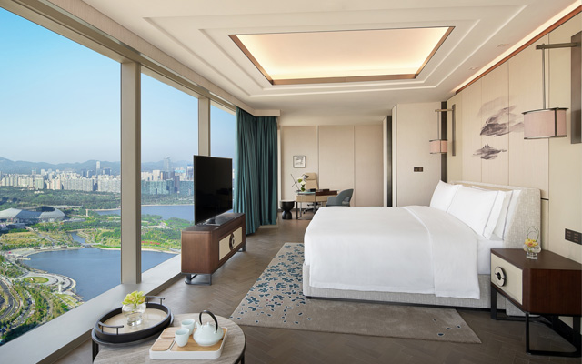 Guests are welcomed through the 34th floor Sky Lobby with views of Shenzhen Bay, where the views extend to the 168 guestrooms and suites above.