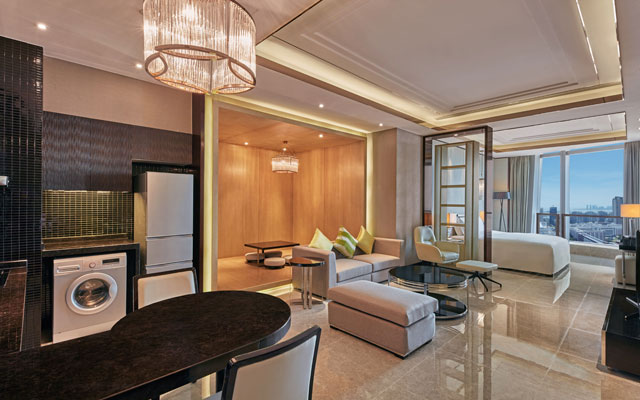 Long-stay guests have added convenience and privacy with a separate lobby for express check-in and check-out services, as well as an exclusive sea view lounge providing self-service coffee and tea on the 31st floor. For guests staying in One Bedroom Apartment, Executive room or suites, they also have access to Executive Lounge on the 57th floor.