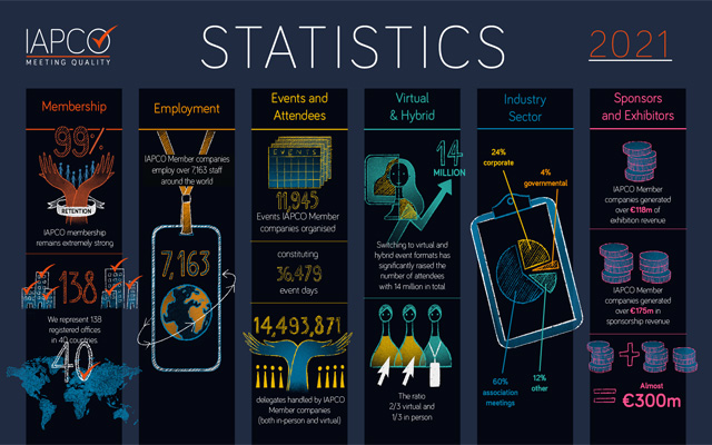 The International Association of Professional Congress Organisers (IAPCO) marked Global Meetings Industry Day 2022 on April 7 with the publication of a full update of its members’ 2021 statistics, where the statistics are based on annual return data provided by IAPCO members.