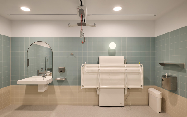 Universal Design principles are evident throughout the space, with fully functional and hygienic fixtures and fittings. These include a height-adjustable adult changing table, a ceiling track hoist system, and a centrally located peninsula toilet.